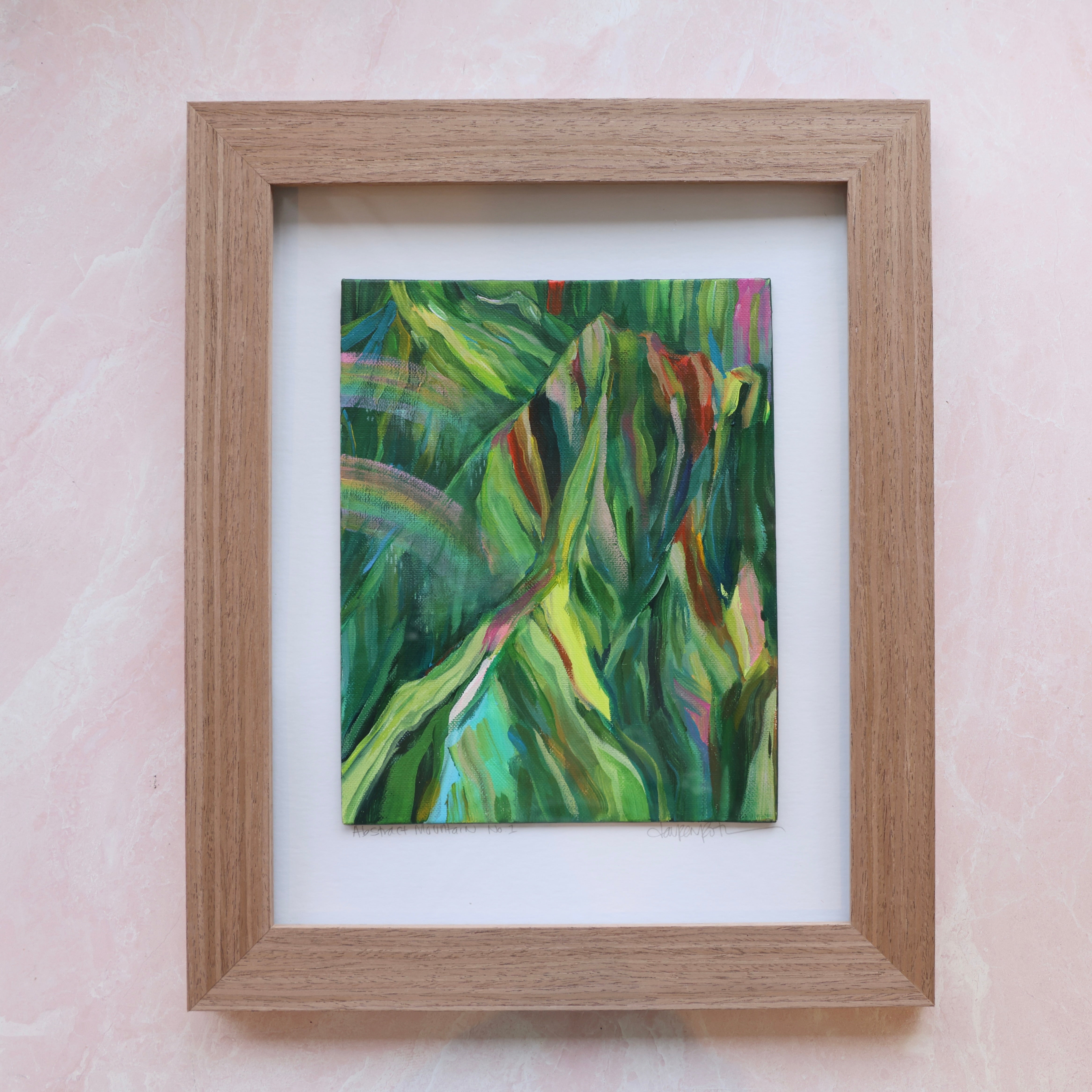 The artwork is acrylic on canvas board, 14 x 11 x 0.5 in. Framed in a locally made warm toned beach wood frame, 17 x 13 x 0.5 in