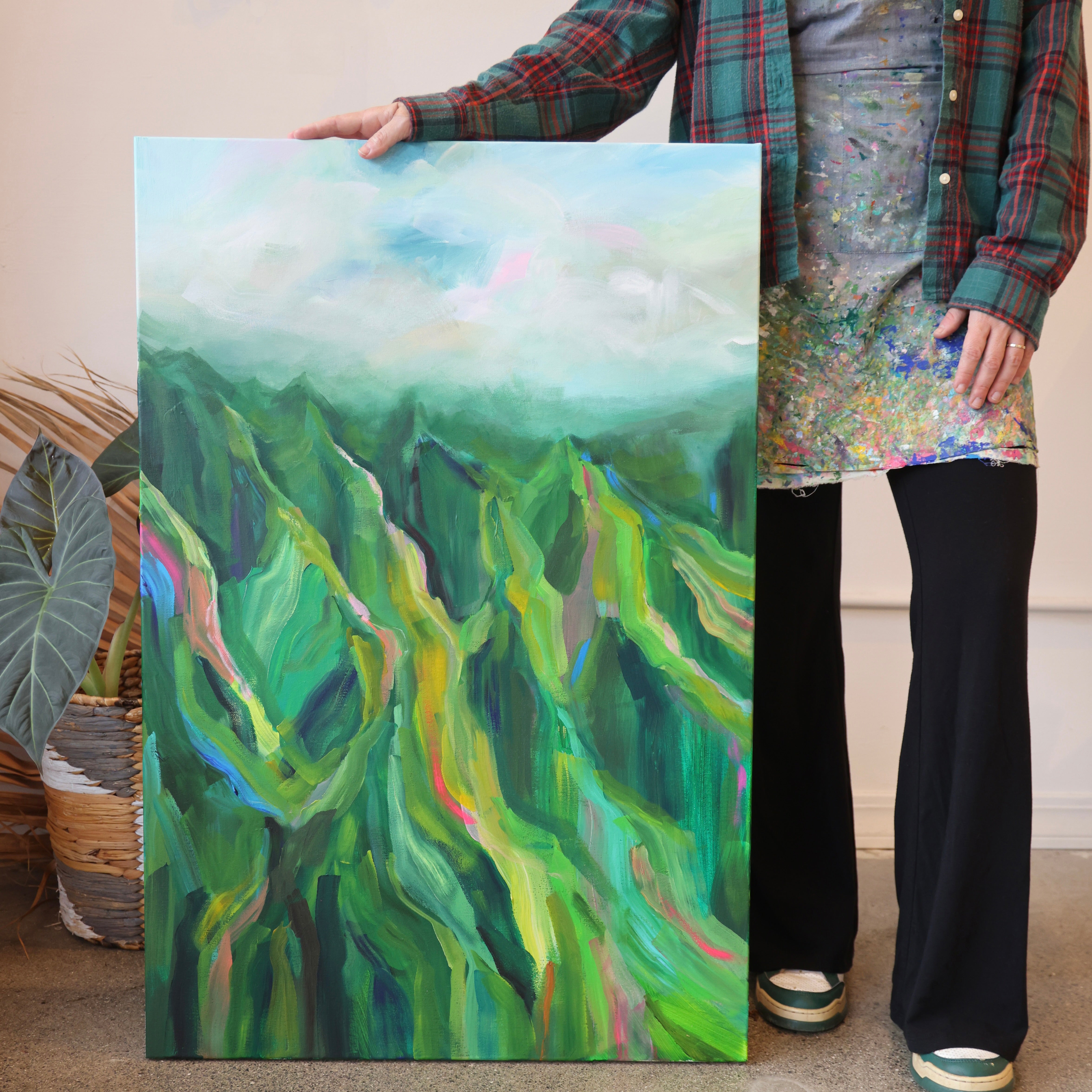 Deep depths of color and movement capture the absolute beauty and powerful grounding essence of the Koolaus in this interpretation of them. Based off of a photo I took while driving through Kaneohe, I loved the way the clouds were sitting over the mountains, and I tried to capture it as best as I could with my paintbrush.