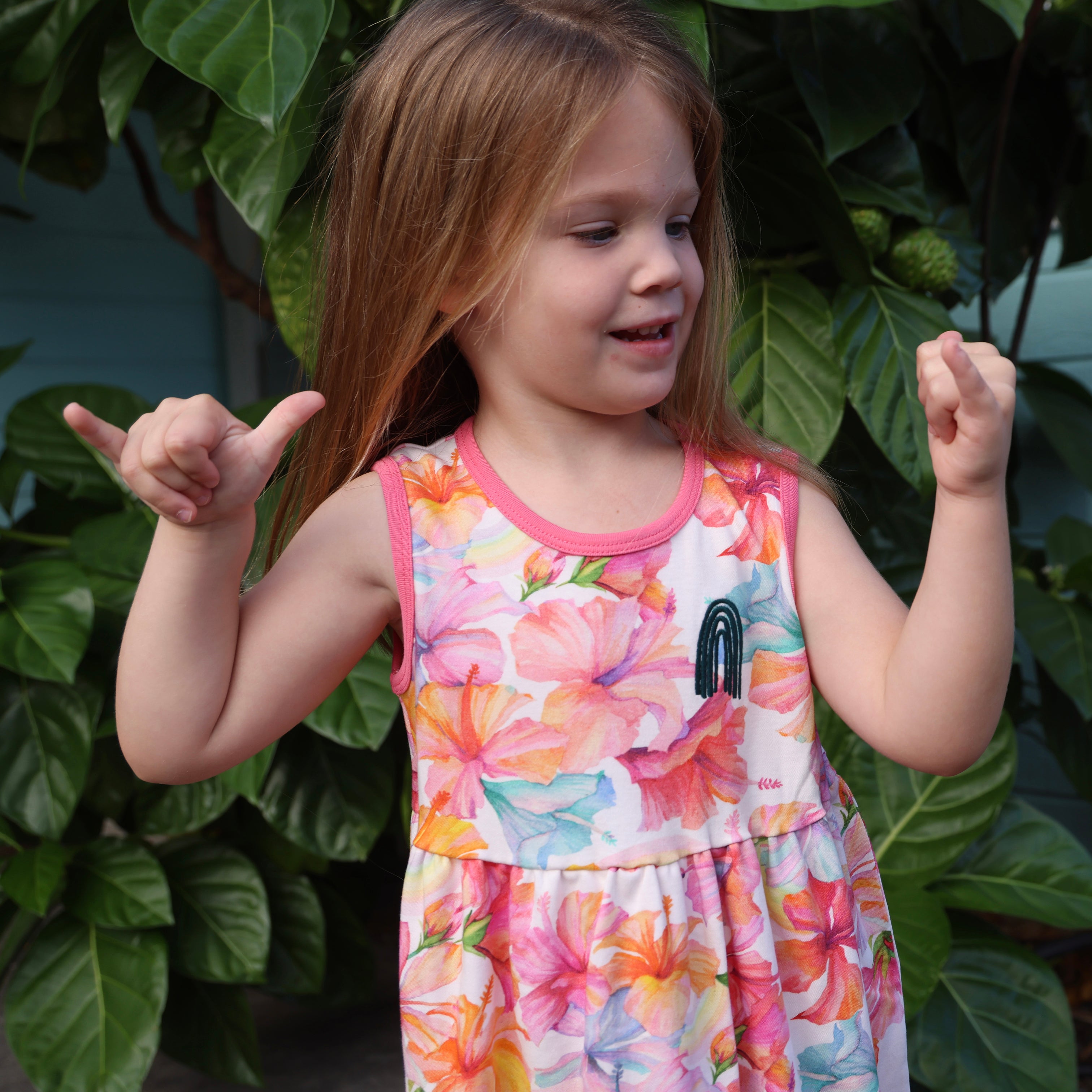 Hibiscus Rainbow dress, designed in Kailua, created to make you smile. Super soft, easy to wash, and uniquely cute!