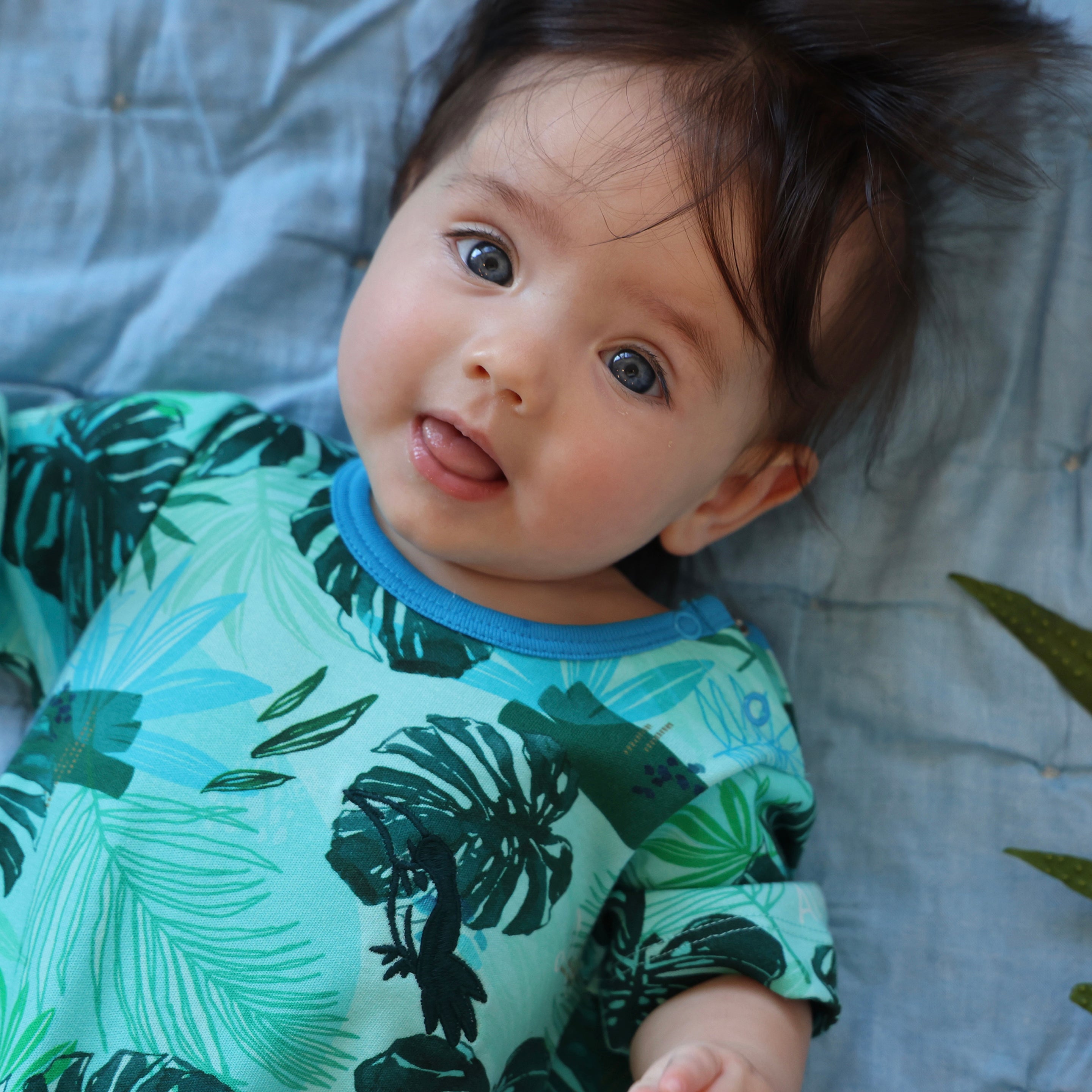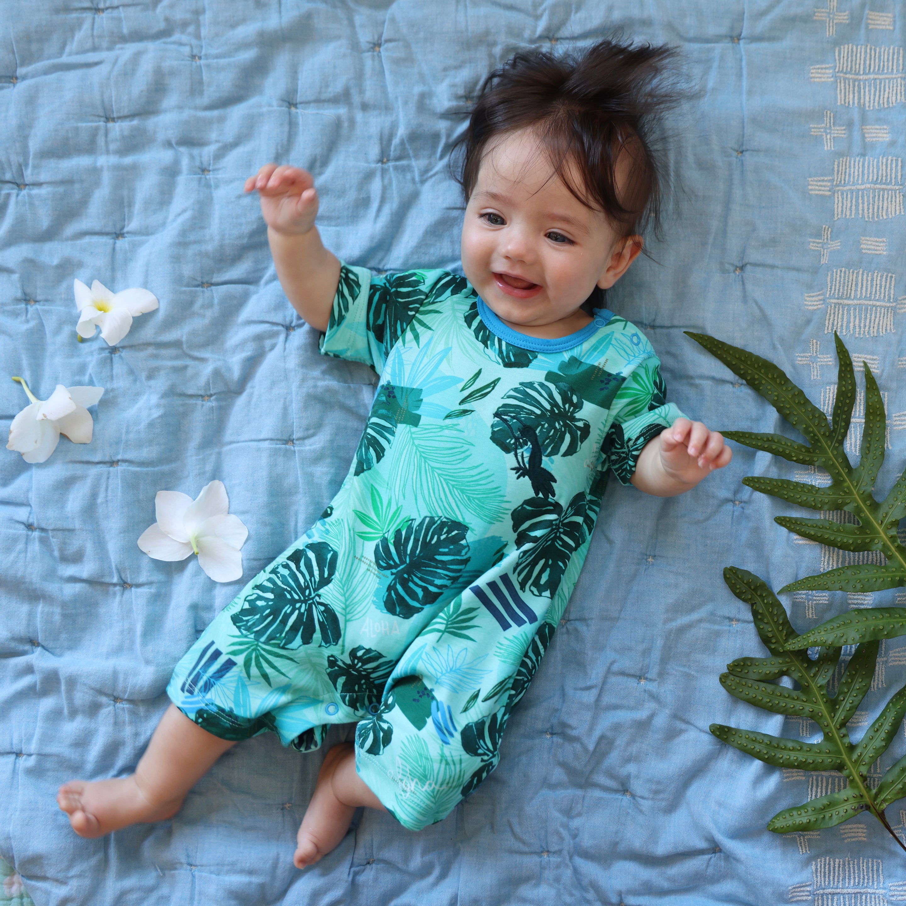 Monstera Vibes jumpsuit, designed in Kailua, created to make you smile. Super soft, easy to wash, and uniquely cute! Little Alohas are hidden throughout the design, can you spot them? There are buttons on the neckline to make getting it off and on a little easier.